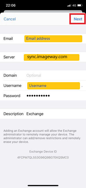 8)Enter your Email address, Server (sync.imageway.com), and Password and select Next (Note: the Password is case-sensitive). |