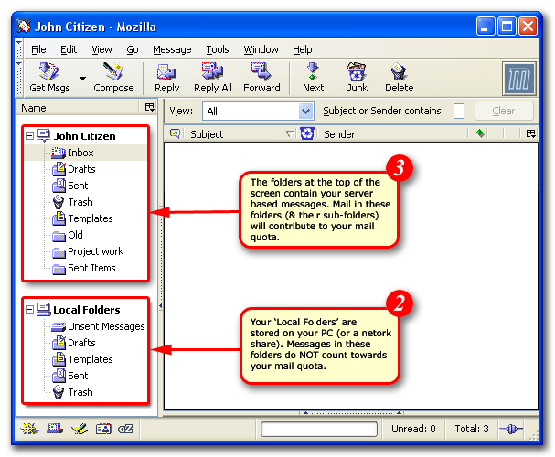 | 3)The folders at the top of the screen contain all your server-based mail. Messages in these folders contribute to your mail quota. As you have a fixed amount of space on the server it is important to monitor the amount of mail in these directories to ensure your account does not go.'Over Quota'. A go.d rule of thumb is to move any messages that are more than a month old to your local folders group. For assistance transferring mail please read below. |