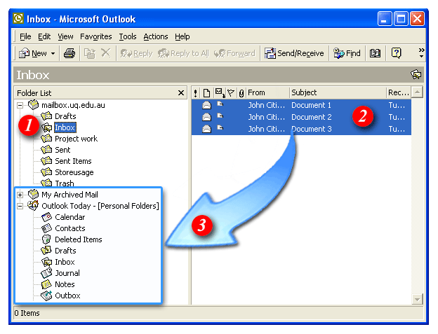 Now that your personal folders have been setup you can start moving some of your old emails from the server-based 'Inbox' to your new local directory. Please follow the steps below: