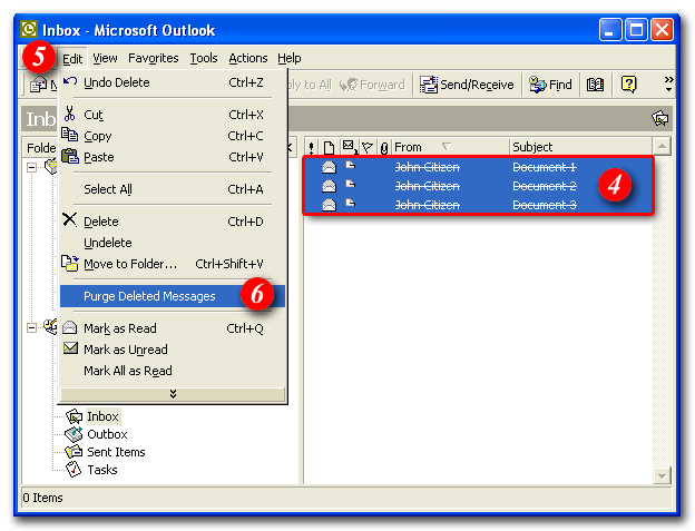 6)Select 'Purge Deleted Messages' - all mail in a status of 'Deleted' will be removed from your Inbox