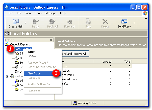 2)Examine the folder list on the left of the screen. Your 'Local Folders' are displayed at the top of the window, and as their name would suggest, are stored locally on your PC. Messages in your local folders do NOT count towards your mail quota.