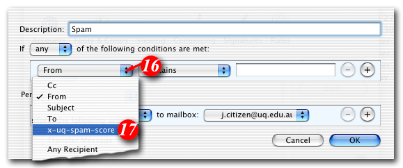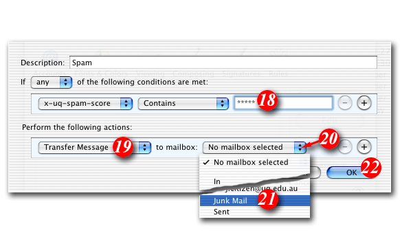 For example, if you wanted to consider anything with a score of 3 or more to be spam, the rule would look like: 'X-SpamDetect: ***'. Decreasing the number of asterisks will result in Mac Mail classifying more e-mails as spam. You may need to check your spam folder more carefully for non-spam e-mails that might have been classified as spam. If you wanted to rate anything with a score of 8 or greater as spam, the rule would look like: 'X-SpamDetect: ********'. Increasing the number of asterisks may result in fewer filtered e-mails being classified as spam and more potential spam staying in your Inbox.